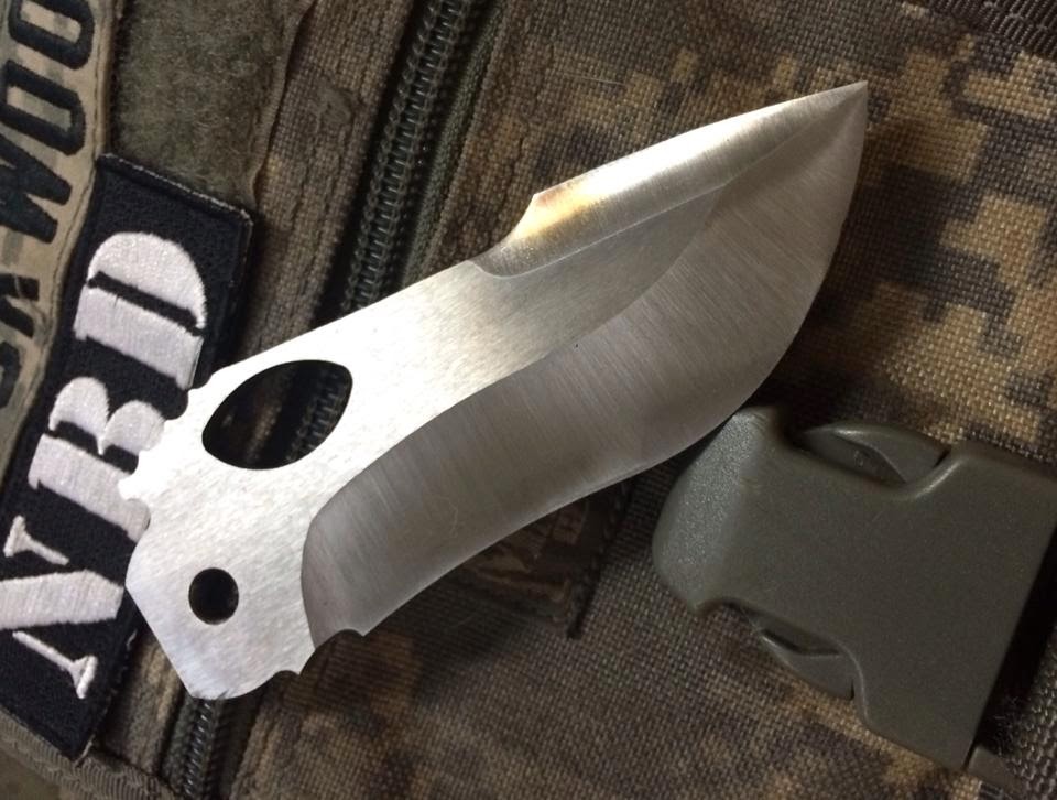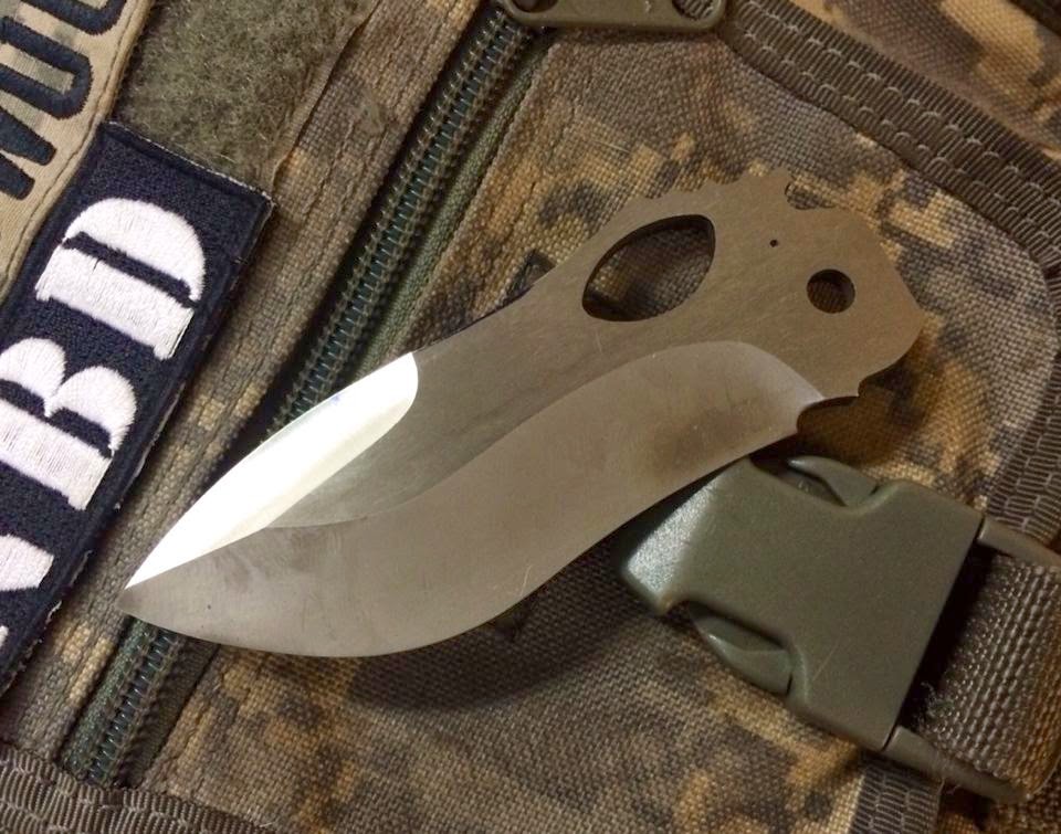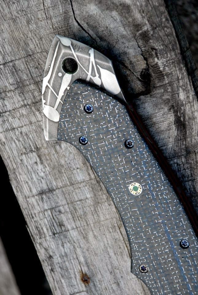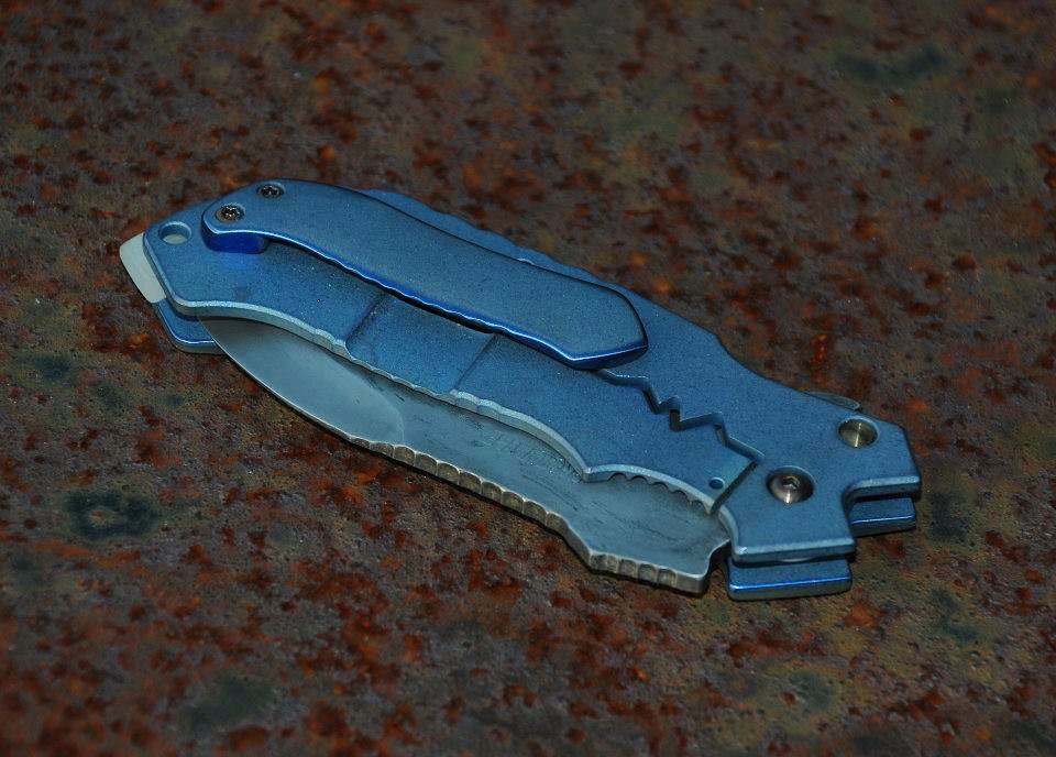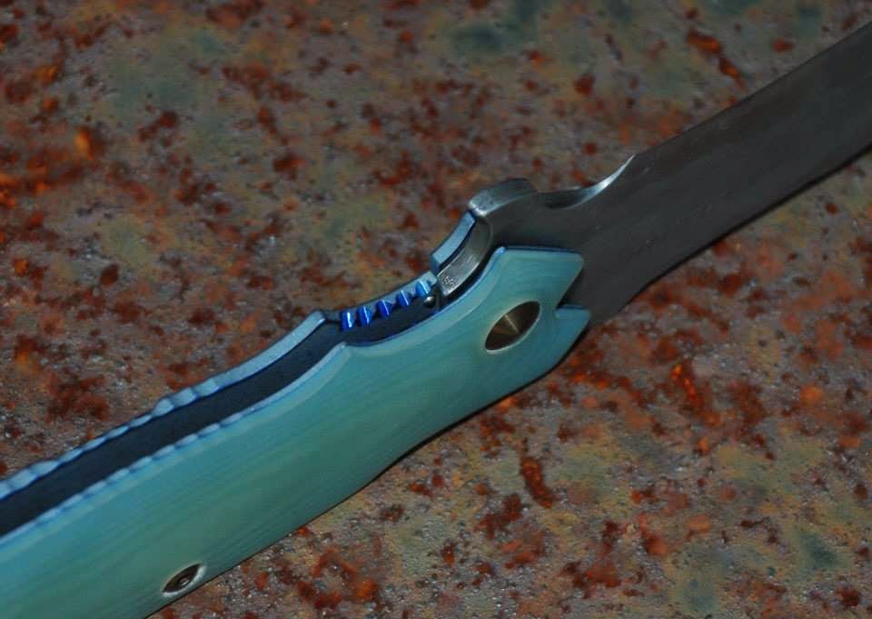 This is a proto with a one sided scale with jade G10. I haven't made any others with a full onlay so far. The backspacer is a blue lexan moonglow. It's not the bright yellow moonglow, a much more soft blue glow that goes nicely with the rest of the frame. The Bruiser features 1/4" pivot and stop pins and 8-32 frame screws. It rides on Teflon bushings with no "banana slots" in the blade. The blade is 1095, clay harded.